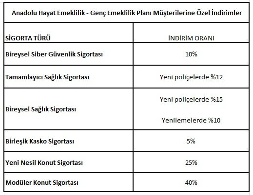 • Anadolu Hayat Emeklilik A.Ş.’ de Genç Emeklilik Planı bulunan 18-25 aralığındaki müşteriler için düzenlenecek poliçelerde, yukarıda belirtilen ürün ve oranlarda indirim uygulanacaktır.